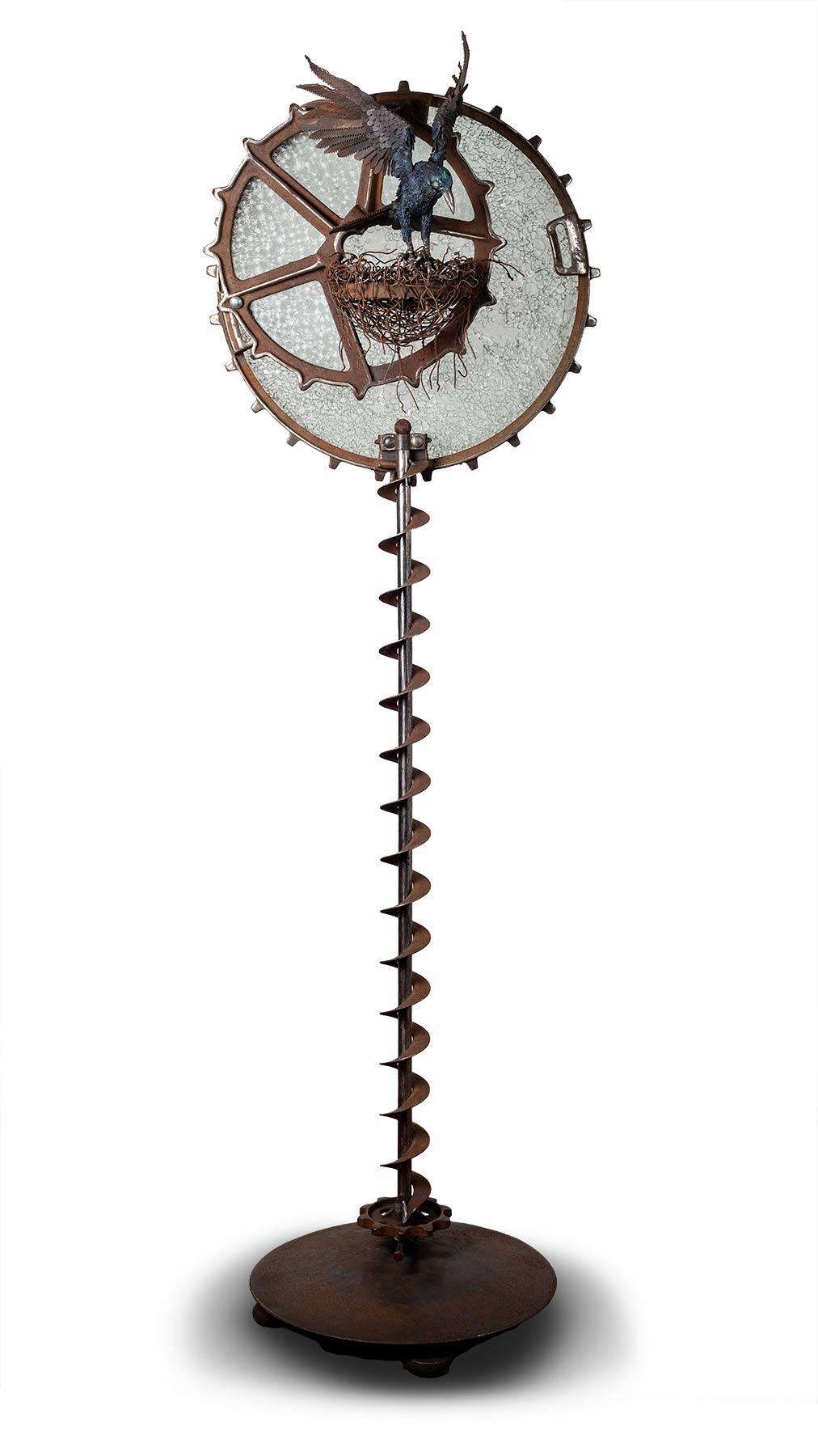 This sculpture is a mixed media piece that is made from ceramics (body) and metal saw blades (wings). The beak is metal and the eyes are custom glass. The bird is perched on a wire nest, and the stand is made from scrap metal with a glass background.